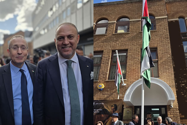 Left: Andy Slaughter MP with Ambassador Husam Zumlot. Right: the Palestinian flag outside the new embassy