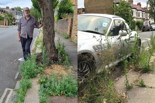 Cllr Thompson on his road and an example of weeds elsewhere in Chiswick