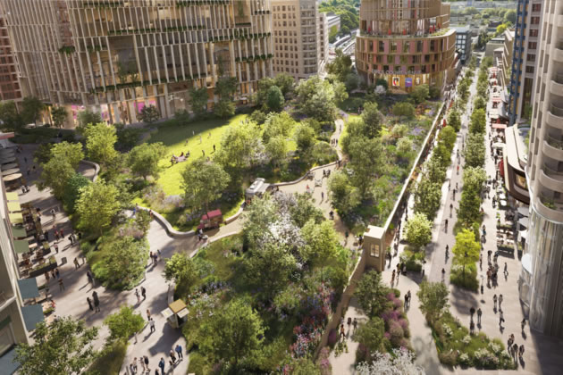 A visualisation showing planned green space in the Earl's Court development. Picture: ECDC