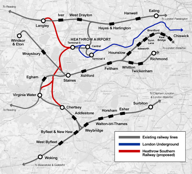 The proposal would see a new track laid from Terminal 5 station down towards the existing South Western Railway network, joining it at Staines.